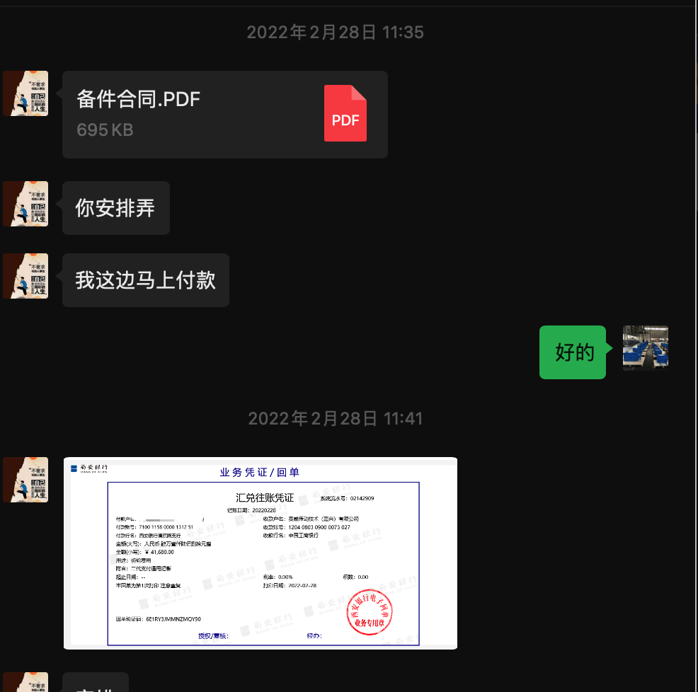 2022年2月26日23:10西安某客户急需诺德SK7027V减速机配件,那天刚好是周末,诺德NORD减速机工厂周末不上班,所以只好说得等周一确定,客户要求周日确定有没有现货,由于这个是老朋友,所以周日拖售后技术确定是有现货的,2月28日上午确定价格随后签订合同,下午我就赶往苏州工厂提货,由于五点后到达苏州工厂,货提不出来,只好等第二天3月1日早上提货,随后3月1日早上九点拿到货,由于客户想和我见一面,所以直接从苏州赶往西安送货,下午三点出发,知道3月2日下午一点到达,客户见到货后非常满意,感谢客户信任。